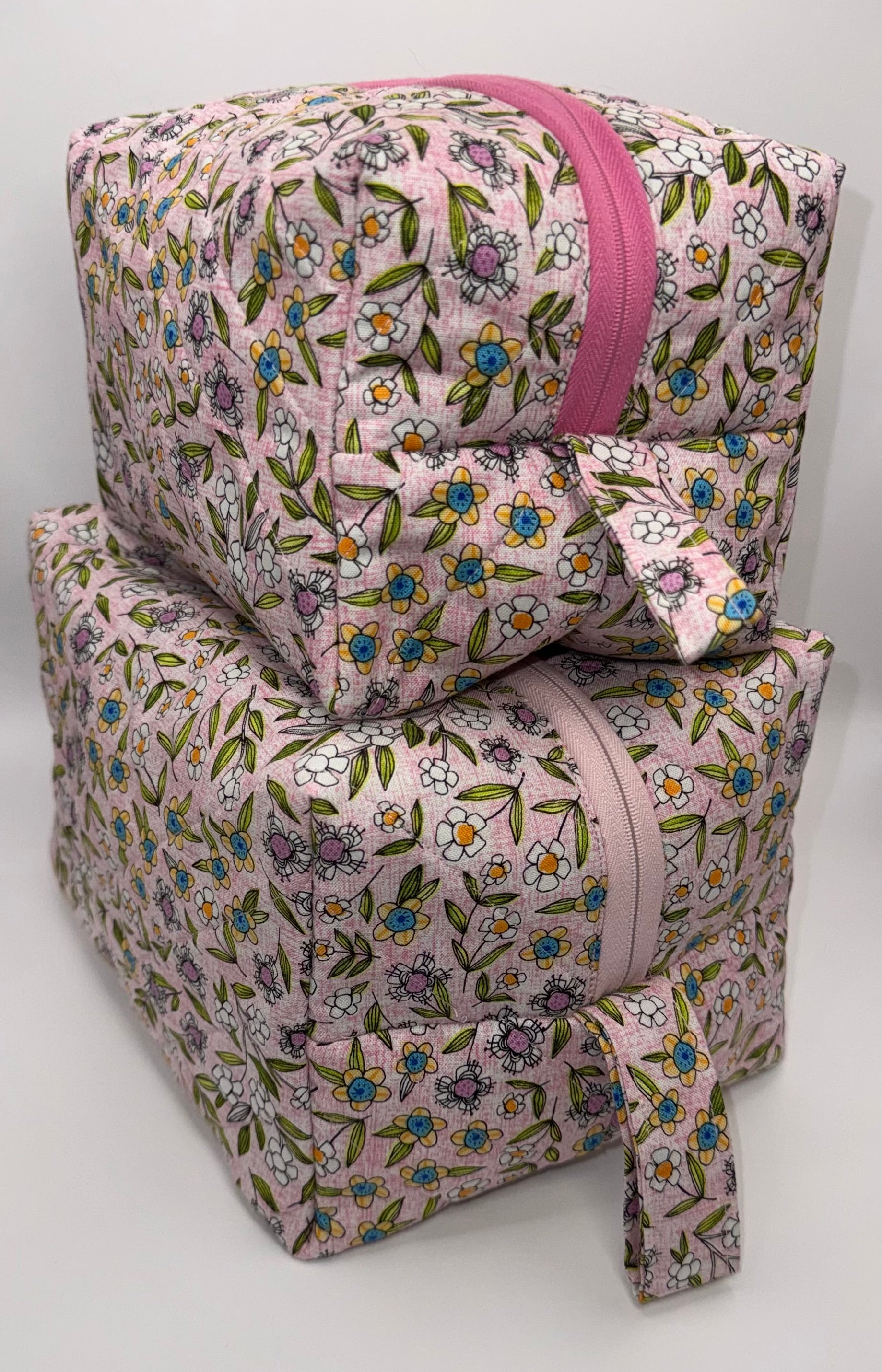 Set of 2 matching pink floral handmade quilted makeup/toiletrie bags. The bags open up to make a basket for accessories. Large & Medium bags included. The large bag measures 8” wide by 6” tall and the medium bag measures 7.5” wide by 4.5” tall.